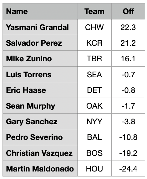 Add everything together and Fangraphs will give you an offensive run value. Three of the 10 catchers finished with a positive value. Guess who.