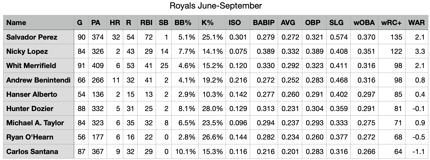 Santana was walking more than he was whiffing. He led the team in OBP and was second to Salvador Perez in slugging. His 126 wRC+ was by far the best mark on the team. As it was shaping up for another ho-hum offensive season for the Royals, Santana represented a true bright spot. A player whose presence definitely lengthened the lineup.