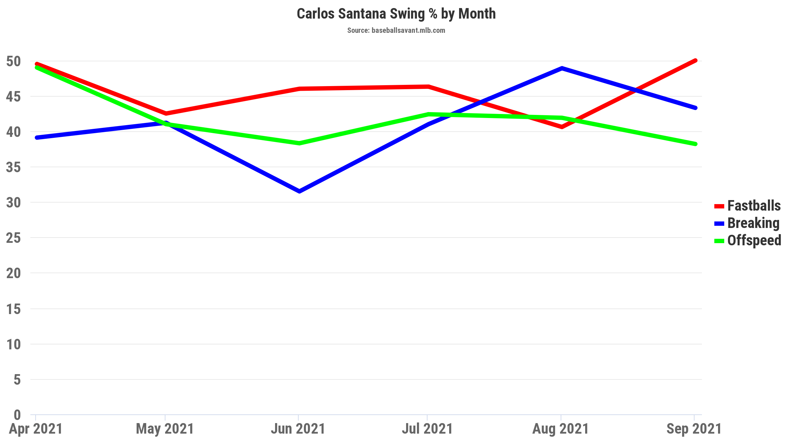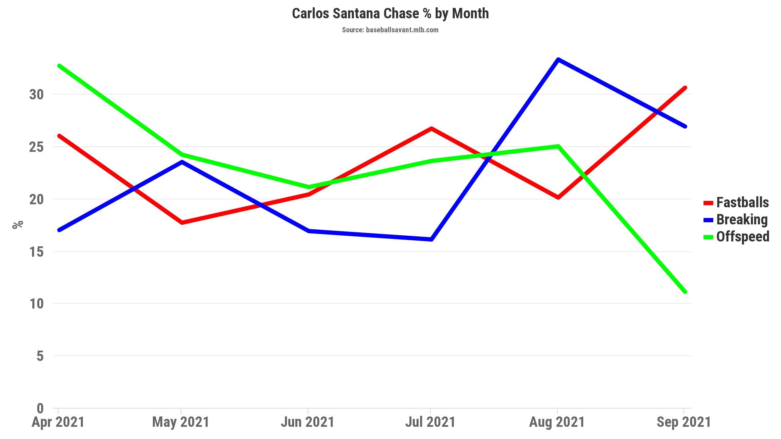 His drop in hard-hit rate is mirrored by an alarming increase in chase rate. Santana has seemingly grown frustrated and has decided the solution to his ails is to swing with greater frequency—at pitches both in and out of the strike zone.