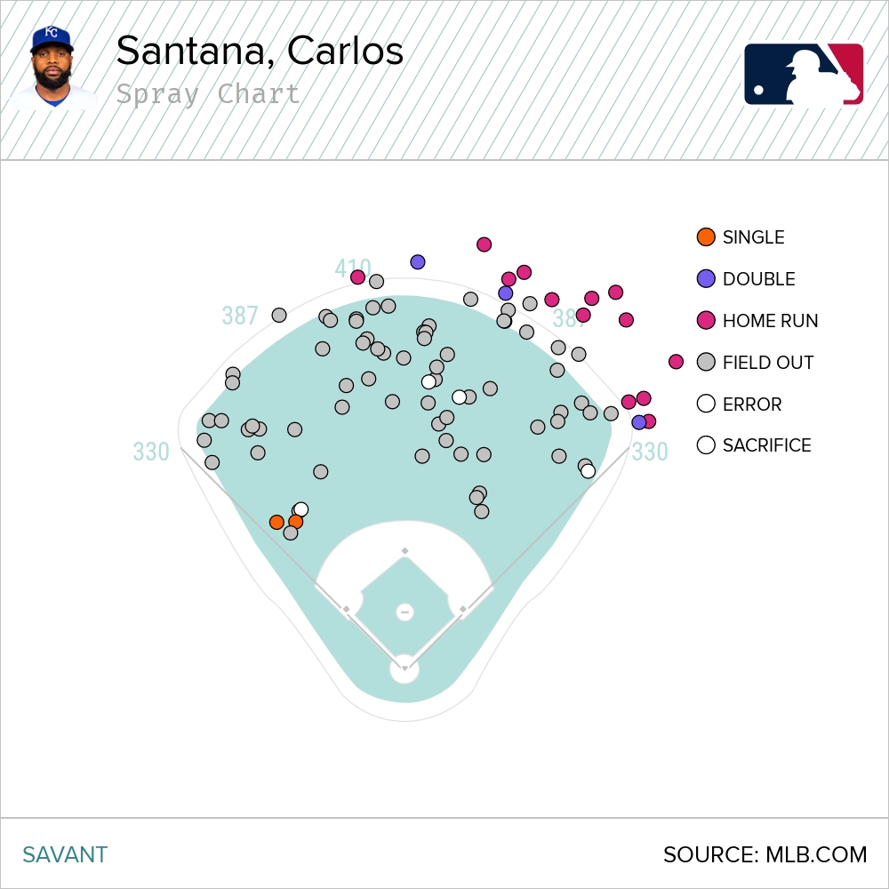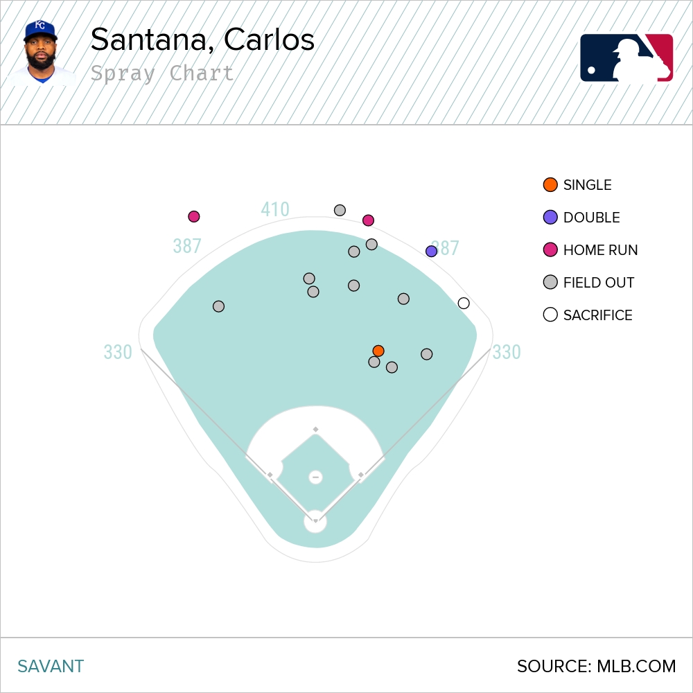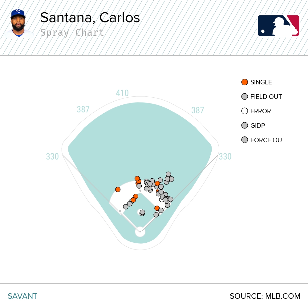 The other problem this has caused is a decline in his walk rate. Sure, there’s a joke somewhere in there that only the Royals could bring Carlos Santana’s walk rate down below 14 percent. He’s currently drawing a free pass 12.8 percent of the time. That’s still a good rate, but given Santana’s track record, that’s more abysmal than anything else. Santana has walked in over 15 percent of his plate appearances in his career. He posted an 18 percent walk rate last year.