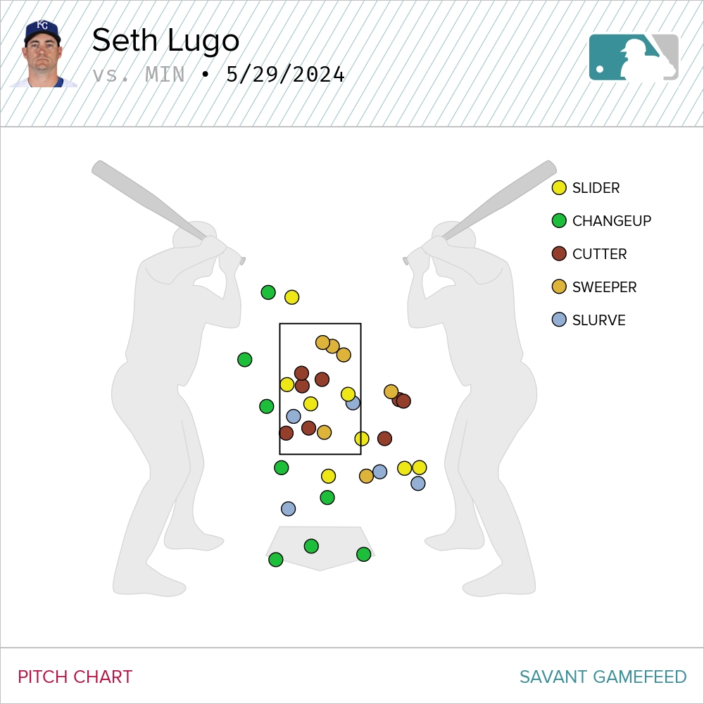 The slider and cutter were thrown for strikes. The change was a waste pitch for Lugo. He didn’t throw one close to the zone and the Twins didn’t bite on that pitch all night. Even so, I’d say just the fact he was throwing that pitch meant it was yet another thing Twins hitters had to look for. Or at least be aware of.