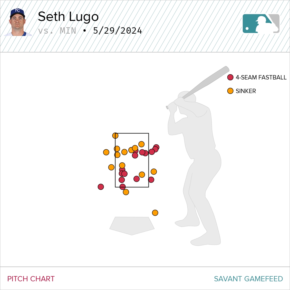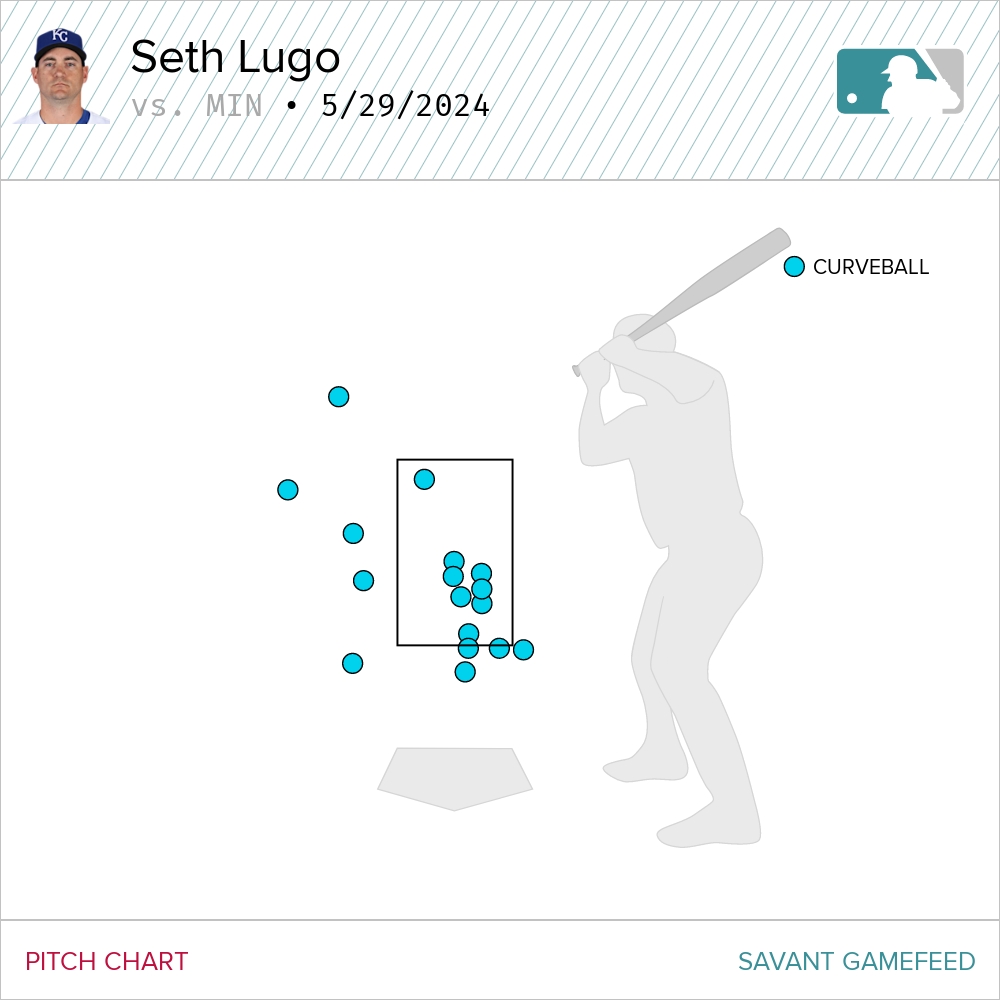 Yesterday, I called Lugo the Royals’ second ace. Today, I’m ready to anoint him The Stopper. The Twins have been a difficult matchup for these Royals, but the veteran starter wasn’t having it. Of his five strikeouts, he got one on his four-seamer, one on his slider, one on his curve, one on his sweeper and the one above on his sinker. I’m having a difficult time typing at the moment because I’m laughing so hard. Lugo is just video game cheat code amazing at the moment.