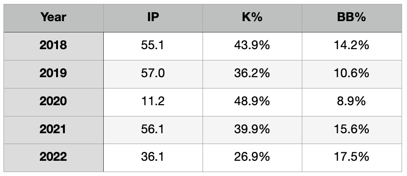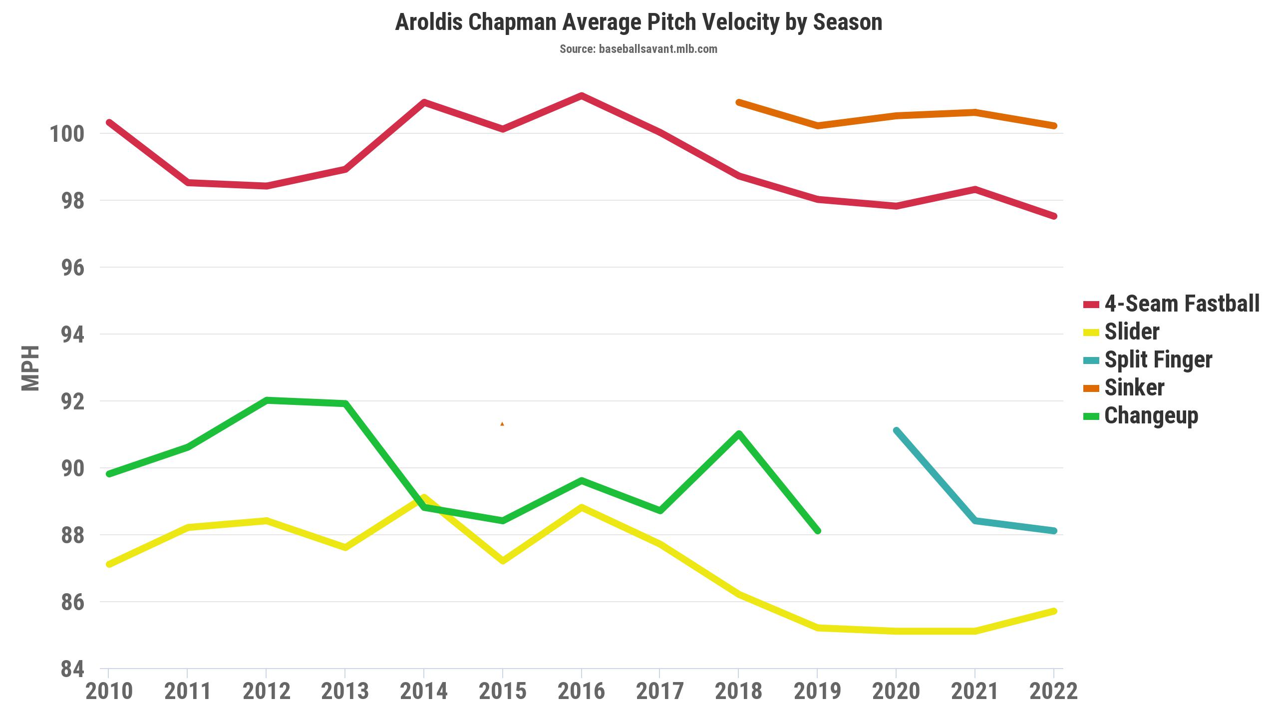 2022 was a disastrous season for Chapman. He finished with the second-highest walk rate of his career, the lowest strikeout rate, the highest FIP and posted a negative fWAR for the first time in his career.