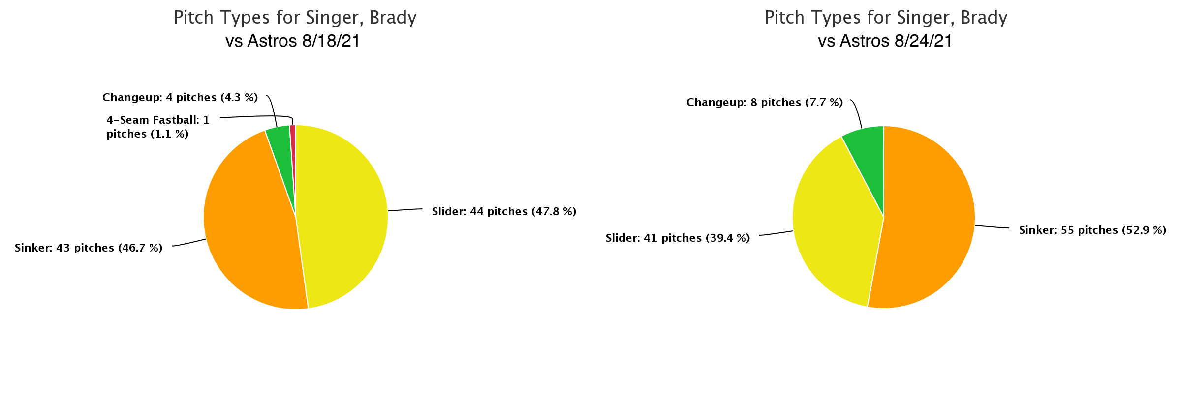 The long battles weren’t surprising given that the Astros received a decent look at what Singer would bring to Tuesday’s game a week earlier. Again, I go back to Lynch’s start on Monday, now he changed his method of attack throwing more sinkers. For reference, here is how Lynch altered his pitch mix.