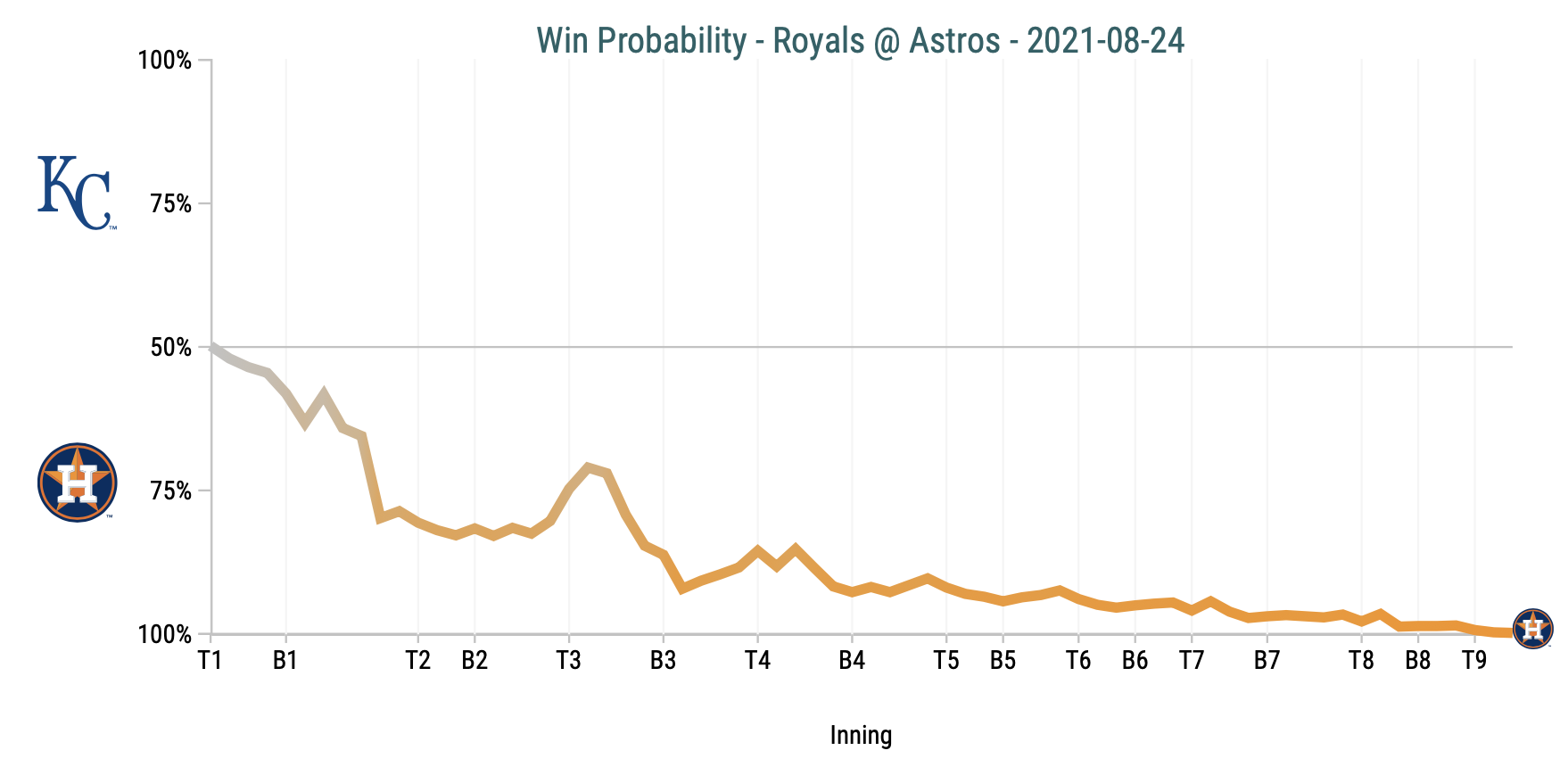 You can see from the win probability chart, after falling into that first inning hole, the third gave them a glimmer of hope, but Michael A. Taylor’s ill-advised dash to the plate essentially ended the game right there.