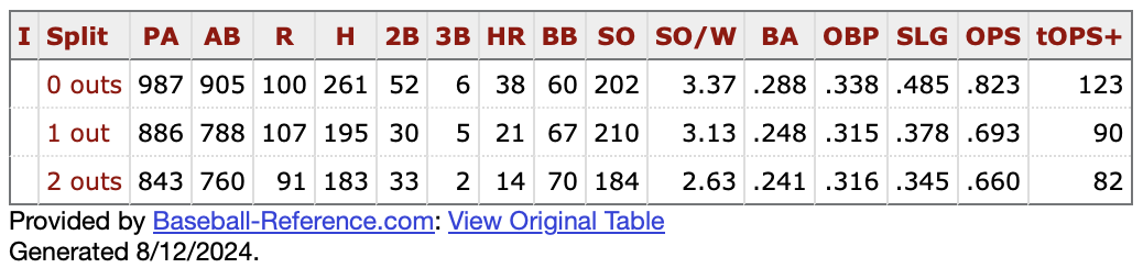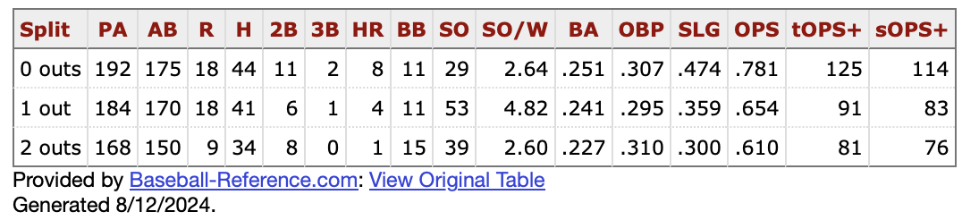 The yearly splits have the sOPS+ number, which is the OPS+ relative to the league. So what you’re seeing above is that Singer is about 25 percent better than the league average when pitching with two outs in an inning. Get to him early in the frame if you can, because he’s going to shut you down late.