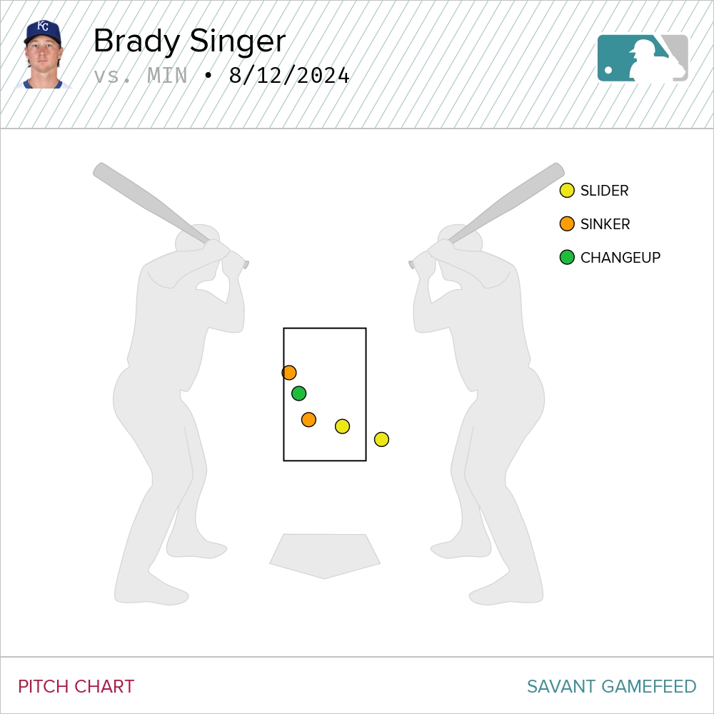Singer was absolutely cruising out of the gate. He punched out four of the first six Twins batters he faced. The sweeper was sweeping, the slider was diving and his sinker had plenty of ride. He racked up five swings and misses over those first six batters and was hitting his spots.