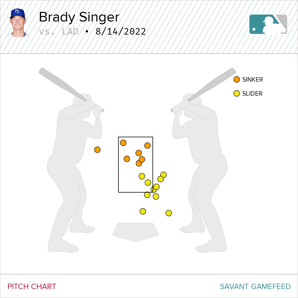 Singer, in holding the Dodgers to just one hit—a single to Chris Taylor in the fifth—recorded 19 swinging strikes, one better than his previous season-high. It works out to a 38 percent swing and miss rate on the sinker and a 50 percent swing and miss rate on the slider. Whew. Here’s where those pitches were located: