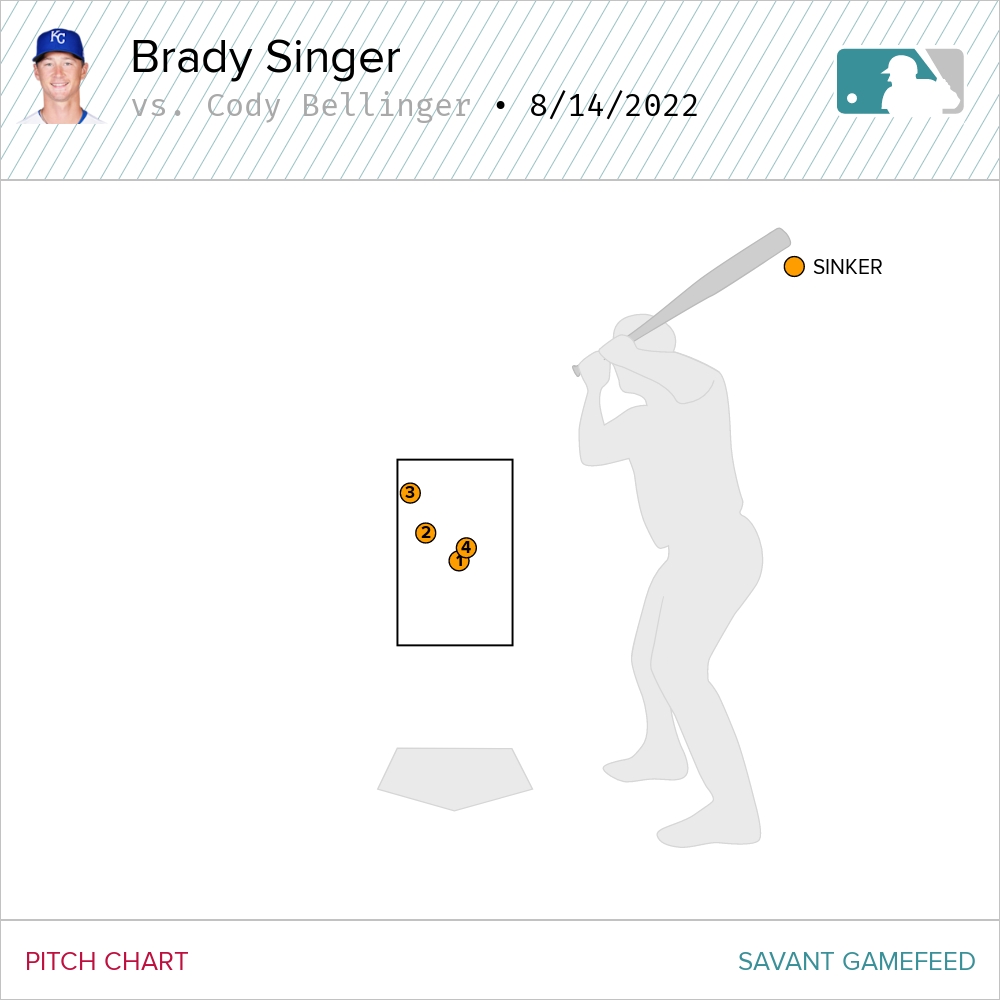 You don’t always have to mix it up. Sometimes, you can just let it rip. Take the battle with Cody Bellinger earlier in the third. Singer threw four sinkers, all in the zone.