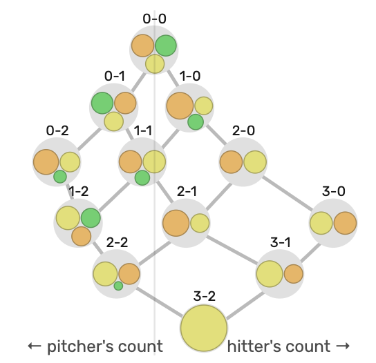 The change is represented by the green circle. The sinker is orange while the slider is yellow. The size of the circle is a visual representation of the percent the pitch is thrown.