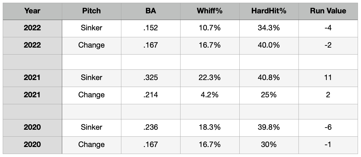 In 2022 Singer is throwing the change in 10.8 percent of his offerings. So just the idea that he’s more likely to throw that pitch is enough to give hitters (mostly lefties) something to consider. The fact he’s ramped up the spin rate adds a wrinkle of deception he’s ultimately using more often.