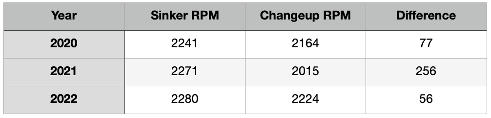The chart below illustrates the difference in spin for the sinker and changeup over the years.