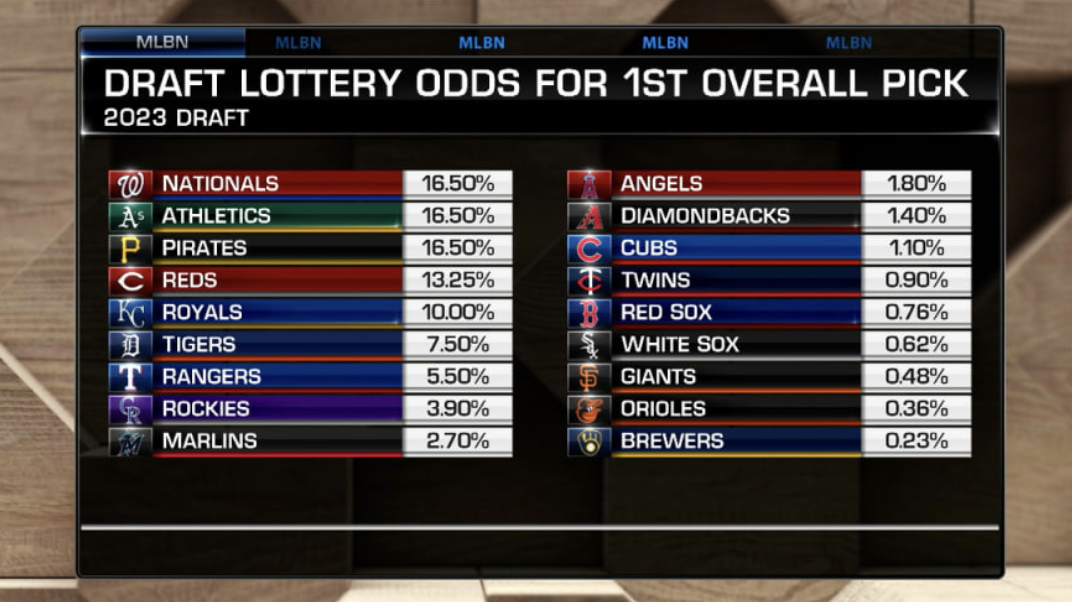 Tuesday brings the draft lottery. A reminder that the Royals, A’s and Rockies have the best odds for picking first. The worst-case scenario for the Royals is if they land the eighth overall selection.