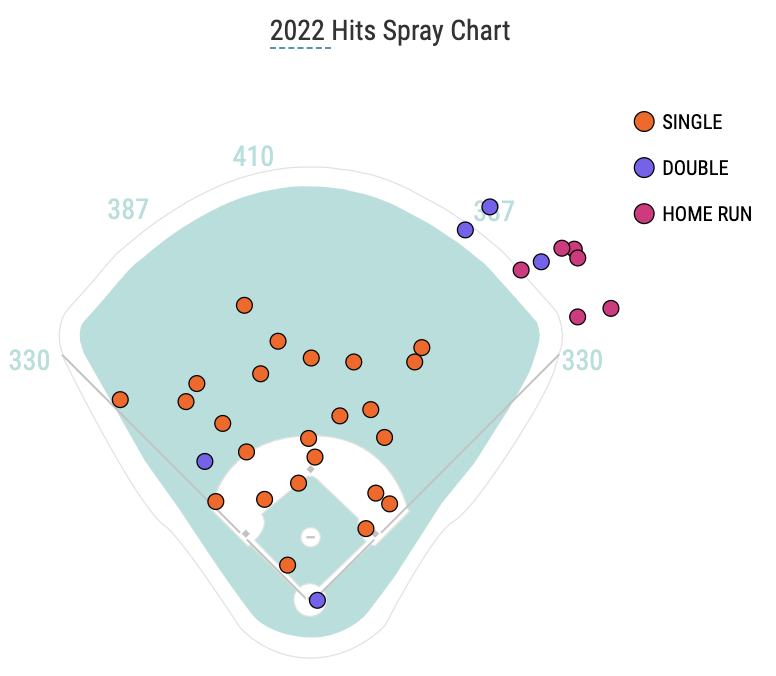 His spray chart for his base hits is equally wild.