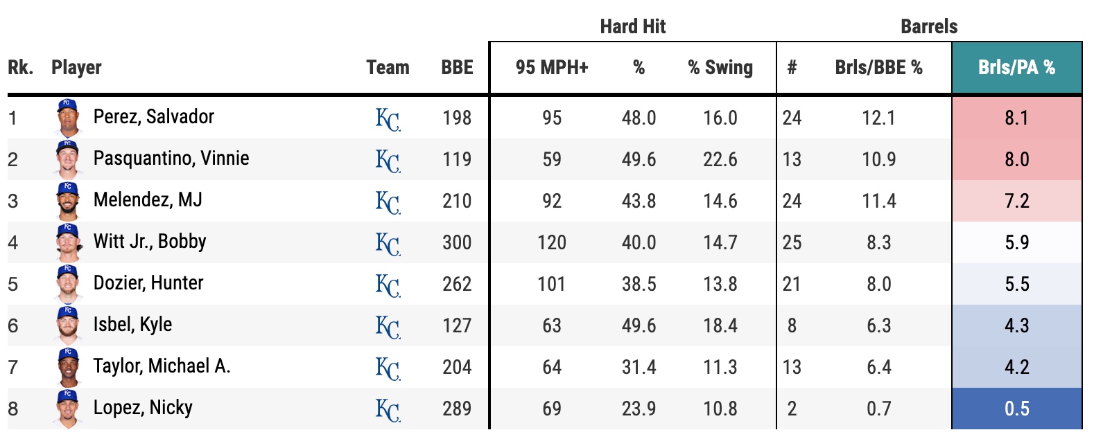 Here’s how the Royals’ hitters look as far as hard-hit rate and barrels (minimum 100 batted ball events).
