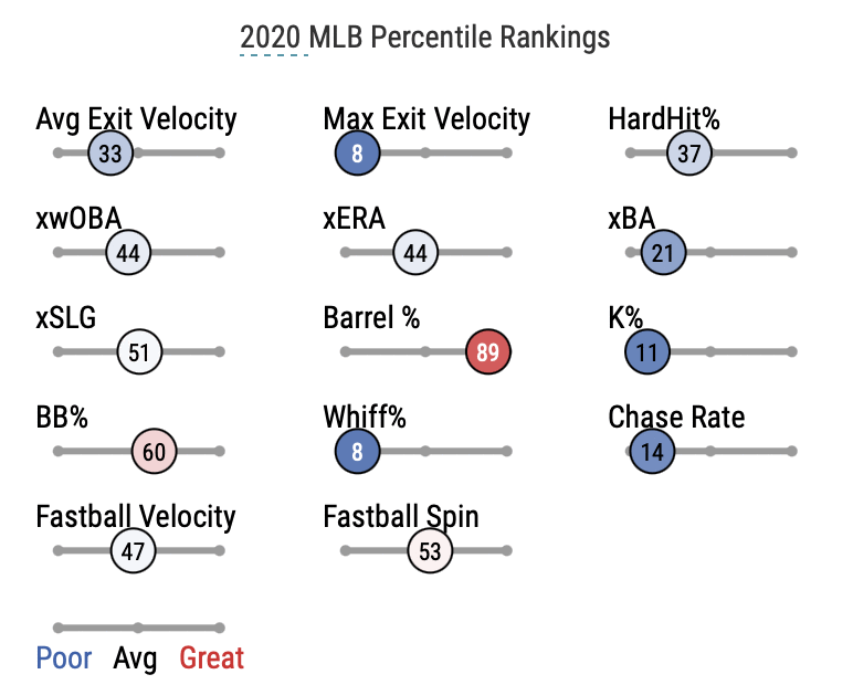All of his key Statcast metrics—while not notable or outstanding previously—have seriously declined. Most notable, his barrel rate. It’s gone from 3.7 percent and the 90th percentile all the way up to 10 percent and the 20th percentile. His Hard-Hit% has similarly increased about seven percent.