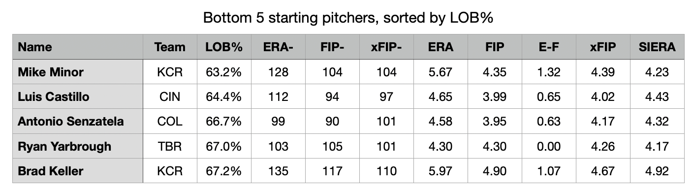 Minor’s current LOB% of 63.2 percent is the lowest in the majors among qualified starters. Another way to look at it is that almost 37 percent of the runners on base when he’s pitching come around to score. That’s an incredibly high number.