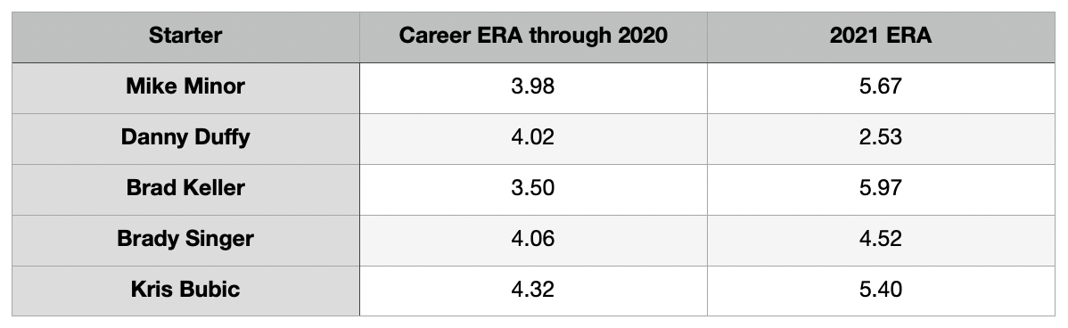 Only Duffy has outperformed his career ERA in 2021 and he’s thrown the fewest number of innings as a starting pitcher of the five listed in the table above. Only Brady Singer has moderately declined. The rest? Woof.