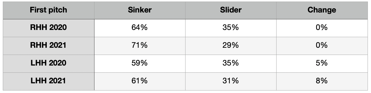 According to Brooks Baseball, Singer is throwing more sinkers on the first pitch in 2021, especially to right-handed batters.