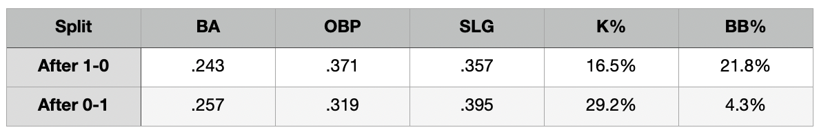 Obviously, when a pitcher fails to deliver a strike on the first pitch, the advantage tilts in favor of the hitter. In Singer’s case, he’s also much less likely to recover and strike out that batter. And the vast majority of the free passes he issues are when he falls behind on the first pitch. On the flip side, his walk rate when throwing a first-pitch strike is far below his full-season rate. He’s much more likely to maintain that advantage and punch out the batter.