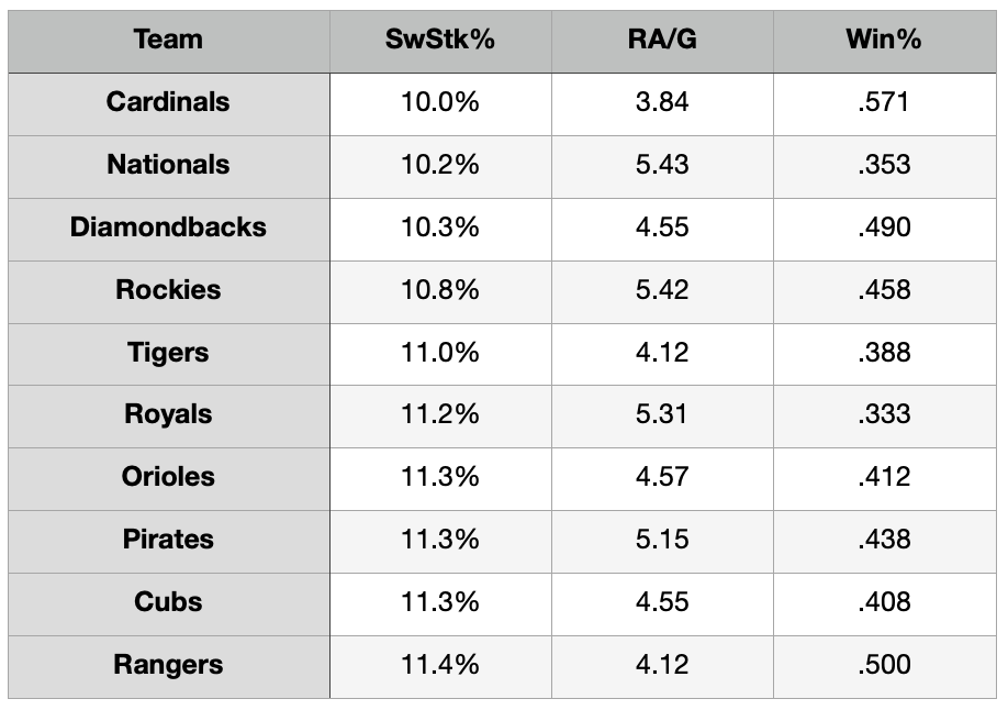 The table below is sorted by swinging strike rate for their pitchers in ascending order.
