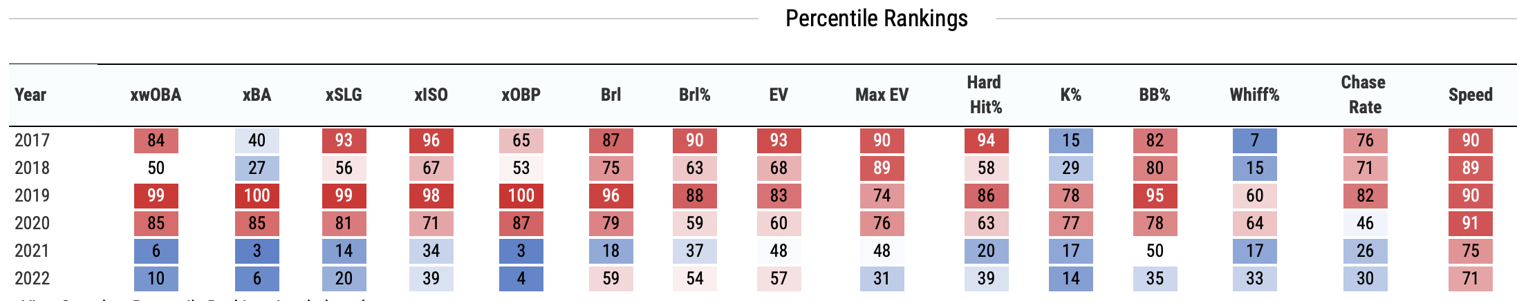 And his services have taken quite the tumble. His walk rate has plummeted. His strikeout rate has climbed. His Statcast metrics are just downright depressing.