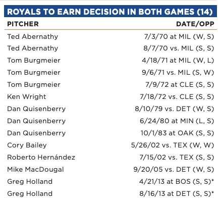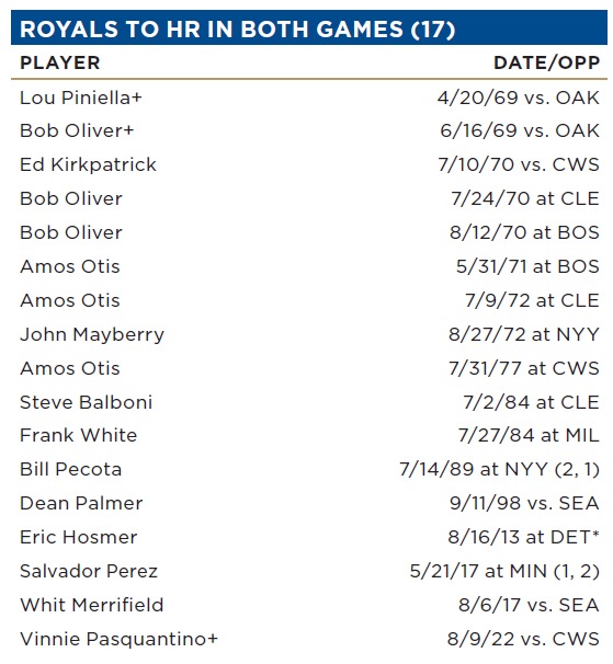A 35-degree launch angle and the ball traveled 438 feet. I love that this graphic concludes by saying it would’ve been a home run at 30 out of 30 ballparks. You don’t say. It was a suborbital blast. From Nick Kappel of the Royals PR department (and relayed by Jake Eisenberg on Twitter, it was the second time in Perez’s career he has gone deep in both ends of a doubleheader.
