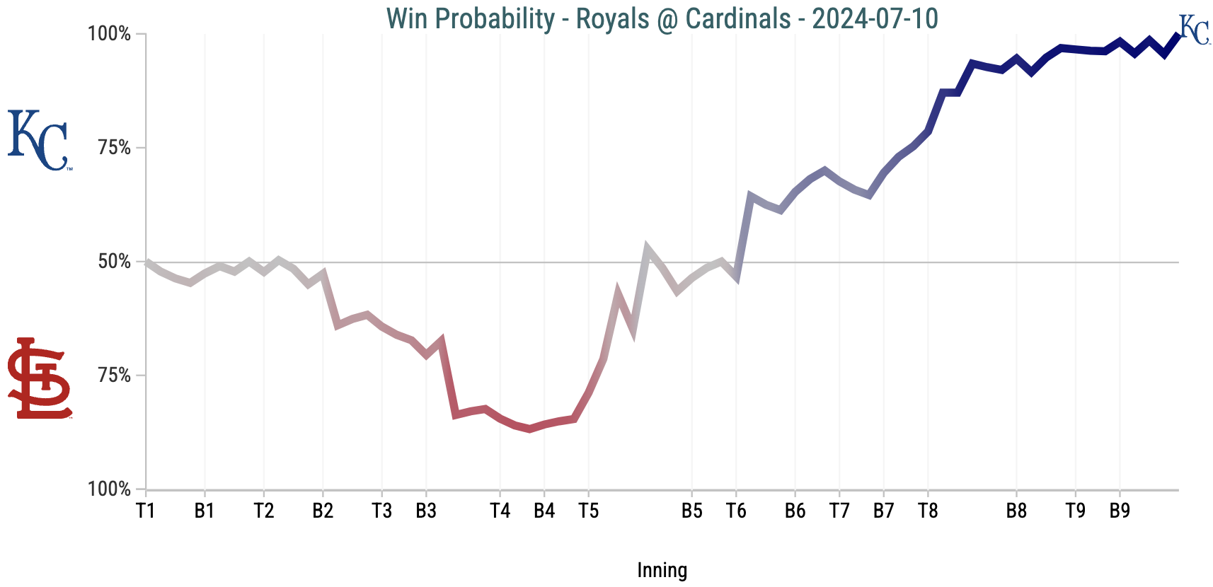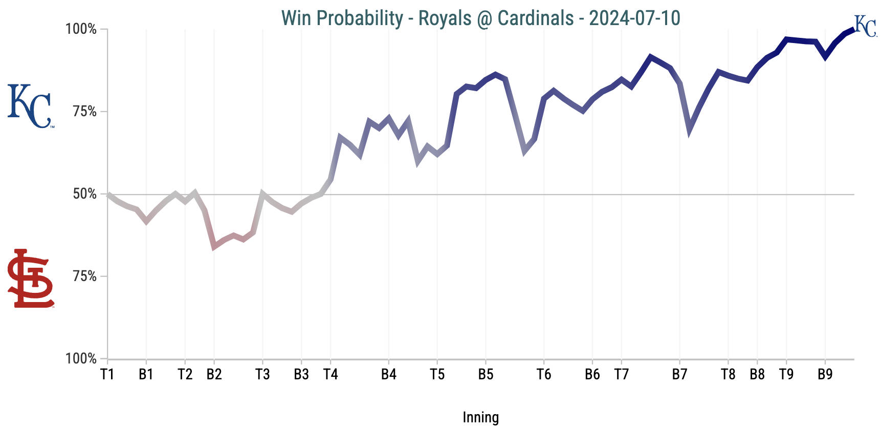 The Royals scored one in the third, two in the fourth, two in the fifth, one in the sixth and one in the seventh. They took the eighth inning off because all that scoring can wear you out. They put up their final run of the night in the ninth. Eight runs all told on 12 hits. A steady drumbeat of offense that’s reflected in the graph above. I hope it felt like torture to the Best Fans In Baseball.