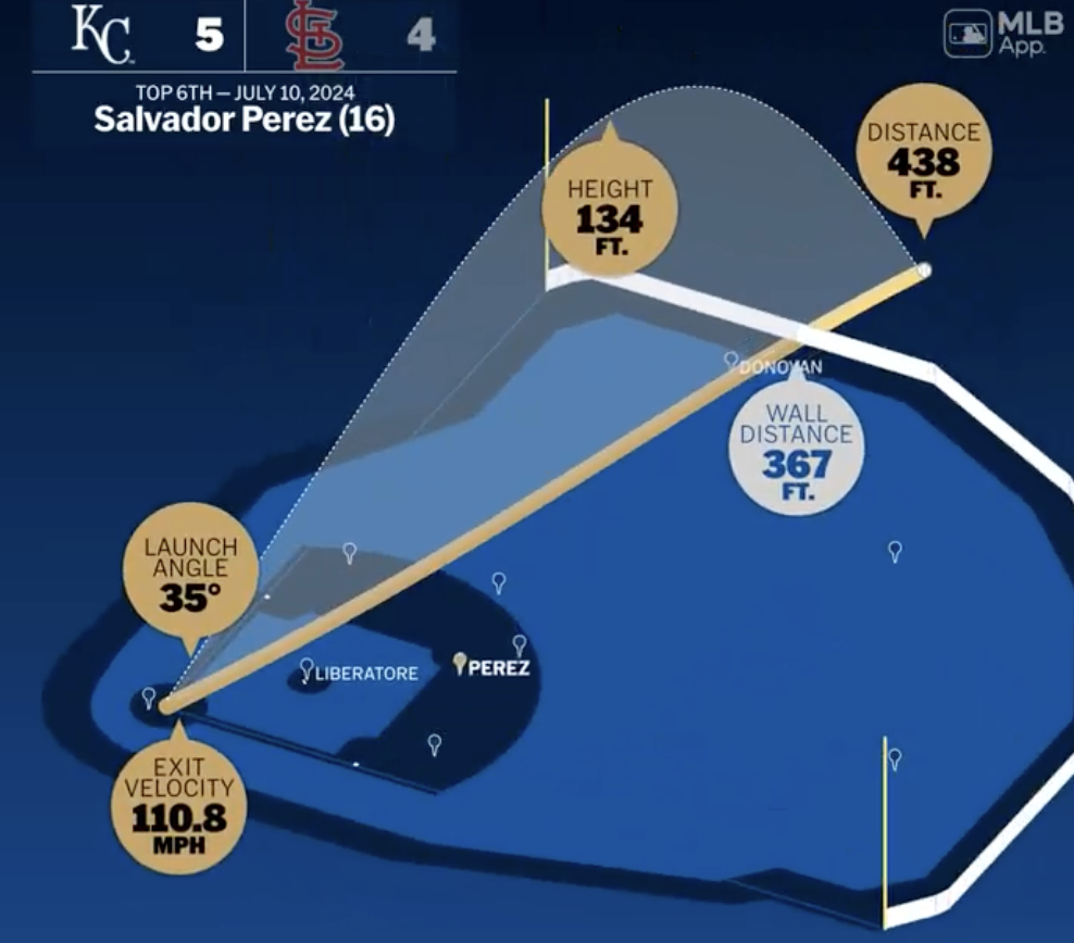 Look at the location of that pitch. And the velocity. For Perez to cover that offering and send it 424 feet is insane. Plus, it had a launch angle of 22 degrees which meant it got out of the yard like it was late for a table on The Hill. Mercy.