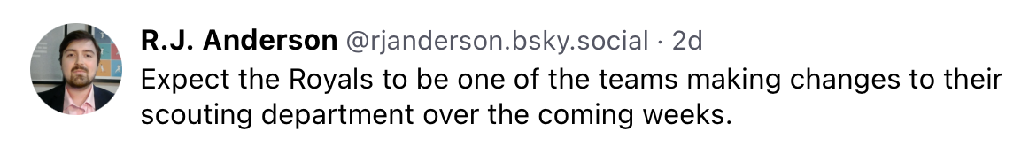 While Watson exits, the Royals have already made a key addition to their scouting department. Keith Law broke the news on Wednesday that the Royals had hired Brian Bridges from the Atlanta Braves to be their scouting director. RJ Anderson of CBS Sports said on Tuesday on Bluesky that changes were coming to Kansas City’s scouting department.