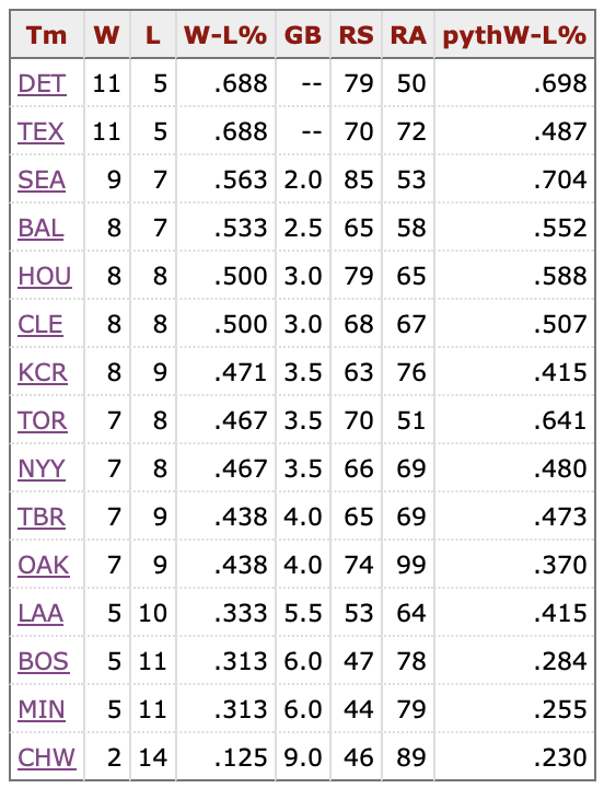 They’re just a half game worse than Cleveland and three and a half games better than the Twins. They’ve jumped ahead of Minnesota in both the AL Central and the Wild Card. I mean look at the Twins…and the Red Sox. I remain intrigued by the Tigers.