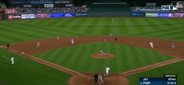 The first batter Jax faces is Pham, who chops a slow roller to short. All hell breaks loose.