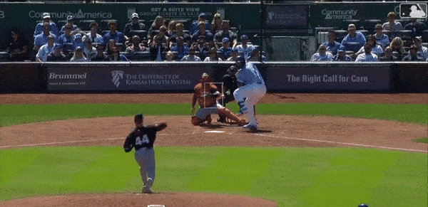 The order of events in this GIF always surprises me. Farmer hits third. We see him get, what…at least 15 feet beyond third on his way to the plate? And then Witt collects the throw from Pham. Witt turns and guns a throw to Salvador Perez at the plate that nails Farmer by a couple of steps. What? How is this even possible?