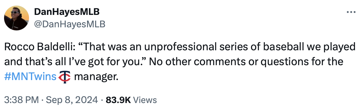 So now exit Durán, and enter Jax. Baldelli is managing this game like it’s October. Given how the Twins have been playing, I don’t blame him. Like the Royals, they are in a favorable position. Unlike the Royals, the vibes are not even moderately positive.