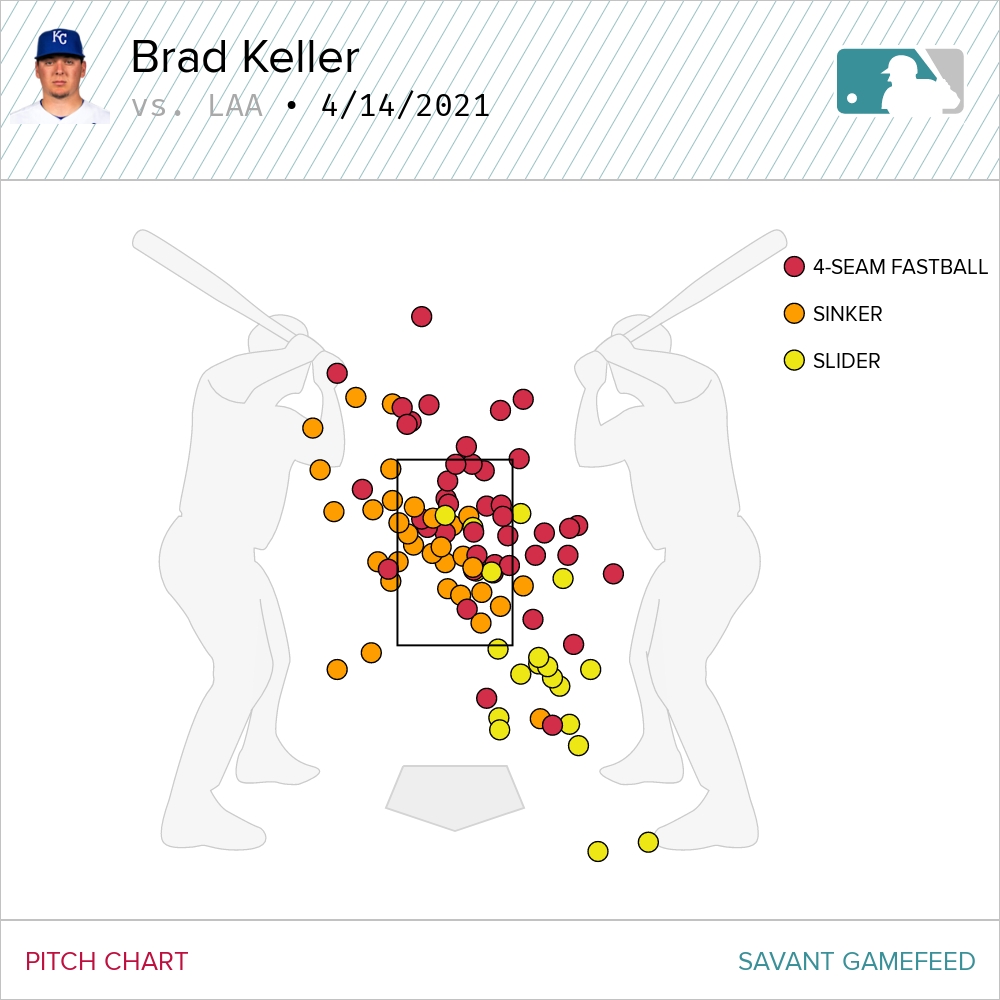Keller still didn’t throw as many sliders as we would normally expect given his track record with the pitch. Last year, he offered the slider about 38 percent of the time. He threw the pitch 21 percent of the time against the Angels on Wednesday, right in line with the average he showed the slider in his two shortened outings previous.