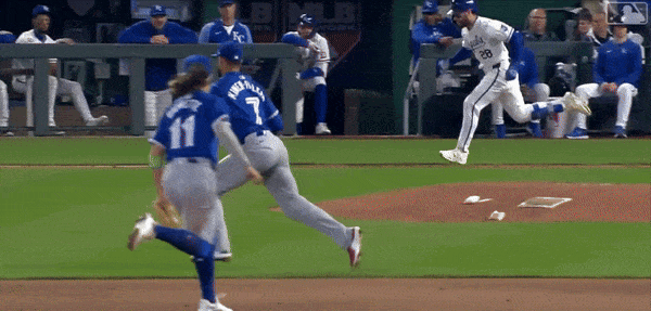 Initially, you’re dazzled by Witt’s backhand, plant and seed he threw to Pasquantino at first. But just as important to get that out recorded was Vinnie’s footwork and the fact that he performed the splits while making the stretch. Seriously, the GIF above does not do the first baseman justice.