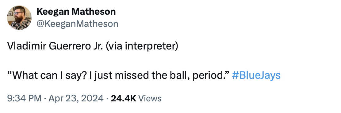 Jays first baseman Vladimir Guerrero Jr. just didn’t catch the ball. A total whiff. Massey scores on the play from second and, instead of heading back out for defense still down two runs, the Royals are on the board.