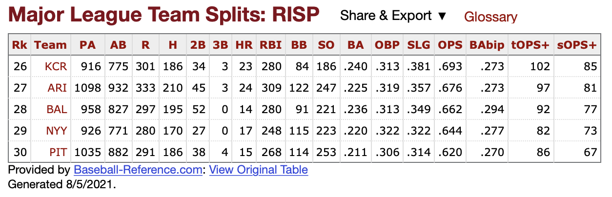 League average with RISP is .251/337/.415 so offensive production increases when the heat is on the opposing pitcher. And as you can see from the Royals’ tOPS+ from the table above, their offense actually improves just a bit when they hit with runners in scoring position. It’s a testament to the lack of overall offensive production that they’re generally better in that situation yet still lag far below league averages.