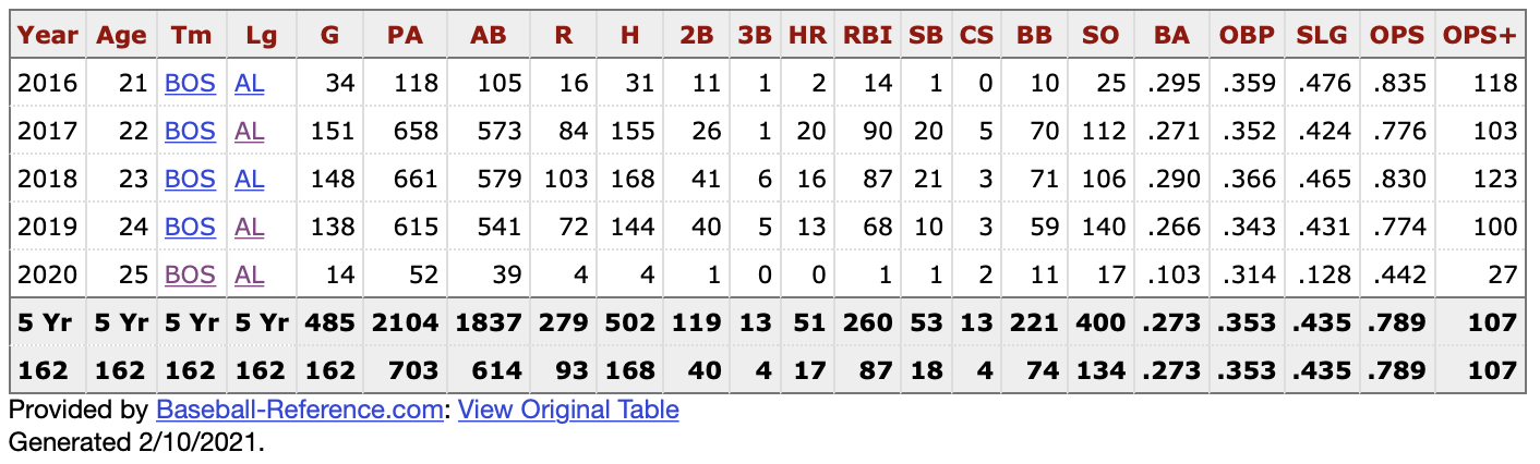 Benintendi logged over 1,000 innings in left field for the Red Sox in each season from 2017 to 2019. In those three years, he hit .276/.354/.440 with a wRC+ of 109. He hit 20 dingers and swiped 20 bags in 2017, but his best overall offensive production came in 2018 when he hit 41 doubles to go along with 16 home runs while walking at a career-best 10.7 percent.