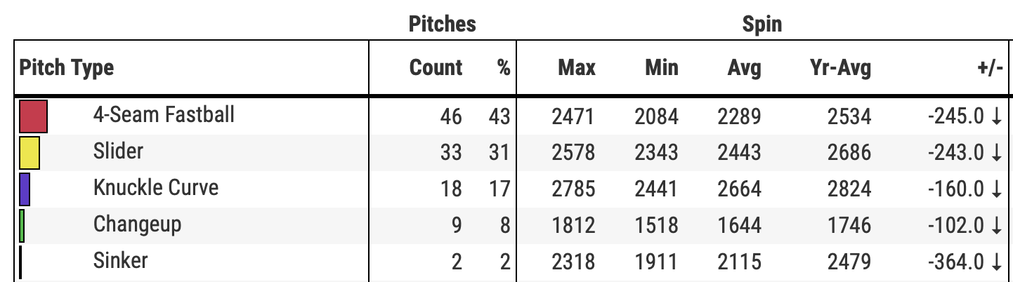 Ummm…those are his lowest spin rates almost across the board since he left Pittsburgh. Very interesting…