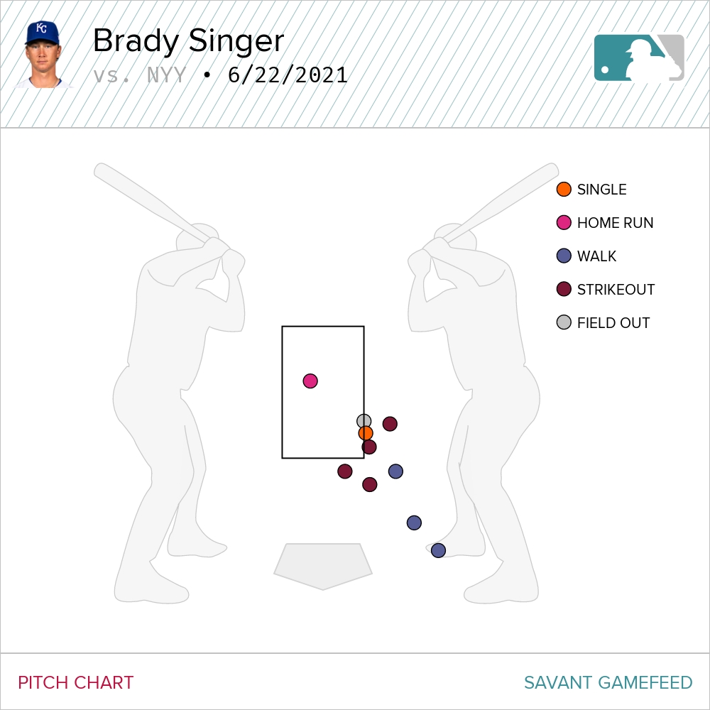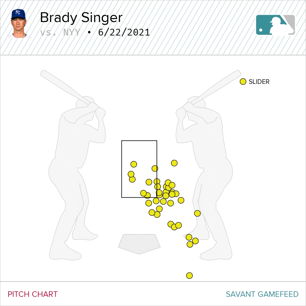 When Singer ran into issues, it was because he really battled his control on his slider, especially in the first and fourth innings. It’s not a pitch that he’s generally looking to throw in the strike zone, but he was really working well off the plate with the pitch on Tuesday. Too far out of the zone. A lot of these were easy takes for Yankee hitters.