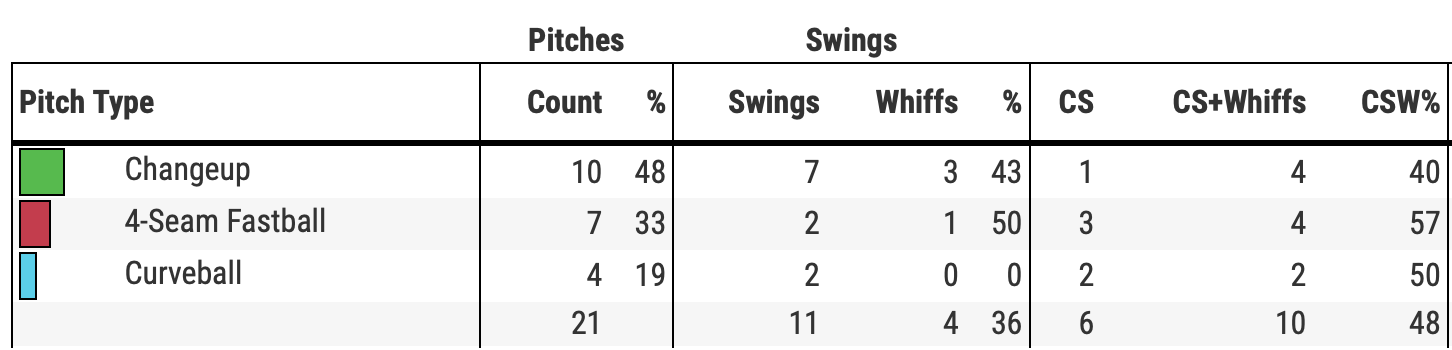 Meanwhile, it was the sinker that was working. Singer finished with a 44 percent CSW% (called strikes plus whiffs) on the sinker which is outstanding. He had 19 swings and seven whiffs on the pitch.