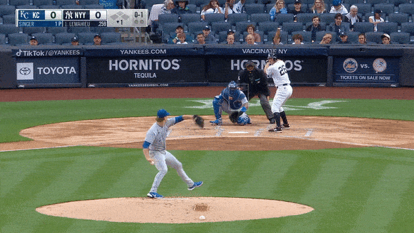 After he got out of that jam on a single pitch, Bubic turned in an outstanding performance over the next two innings. He kept the change-up down and on the corner. He mixed in only a handful of fastballs and picked his spots with precision early in the count. Five of the seven he offered were the first or second pitches of an at bat. It was running a little livelier than usual, clocking in at 92 mph on average, a couple of ticks higher than his norm. And the separation and location with the change made it a frustrating turn through the order for the Yankee hitters. Look at where Salvador Perez wants this pitch. Look where Bubic delivered.