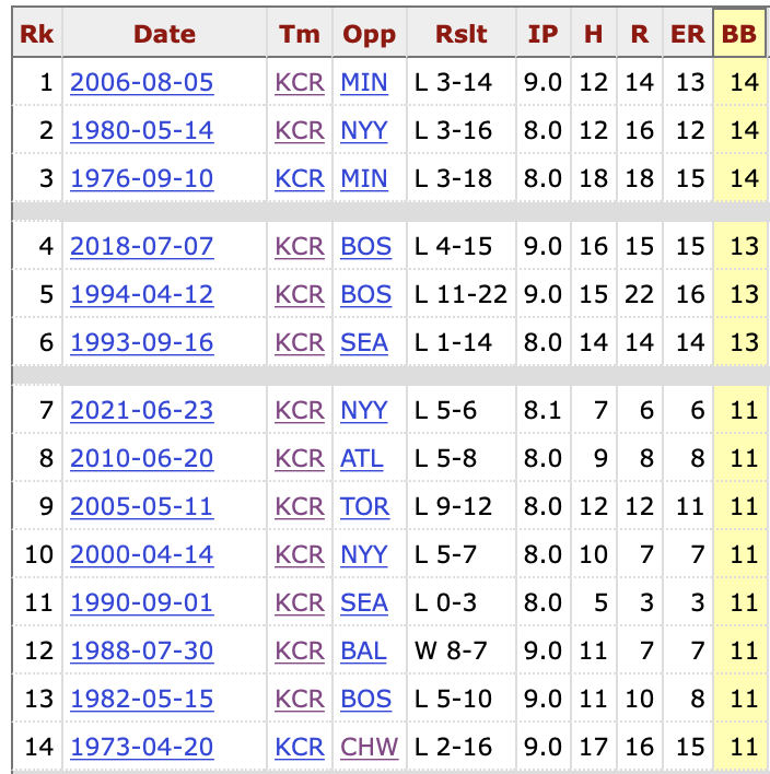 Royals’ pitchers combined for 11 walks against 10 strikeouts on Wednesday. It was the 14th time in club history that they walked at least 11 batters in a nine inning game.