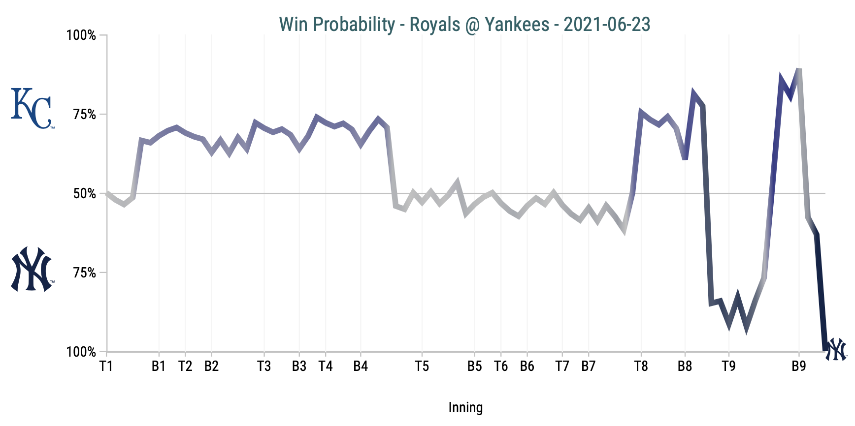 If you’re looking for a sure-fire guarantee for a Royals loss, have them walk 11 or more batters in a game. They simply made things more difficult for themselves than it should have been. That it was as close as it was and decided on the last pitch of the evening is more an indictment of an inconsistent Yankee offense than anything else. After going 0-10 with runners in scoring position on Tuesday, New York followed that up with a 2-6 performance with RISP. It just so happened that one of those hits came in the bottom of the ninth.