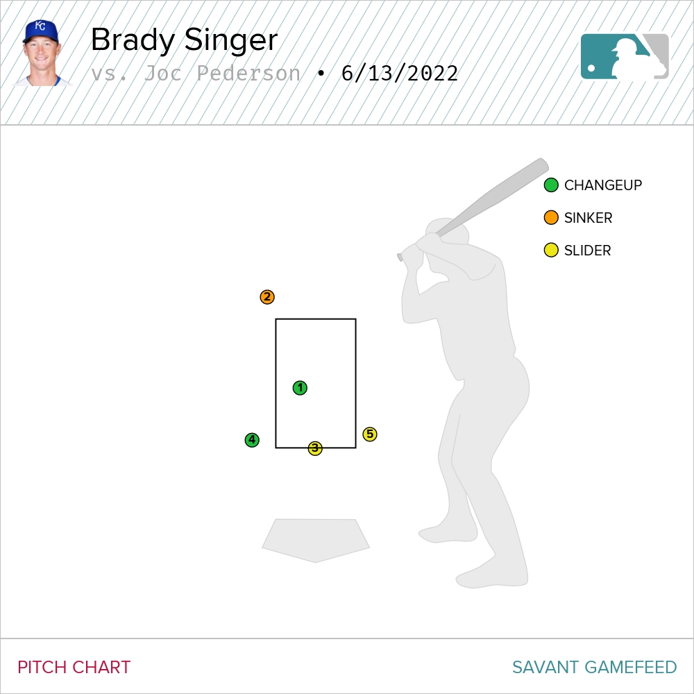 That slider was set up by a pair of changeups away, including the previous pitch. From Baseball Savant, here is the sequence Singer used to strikeout Pederson: