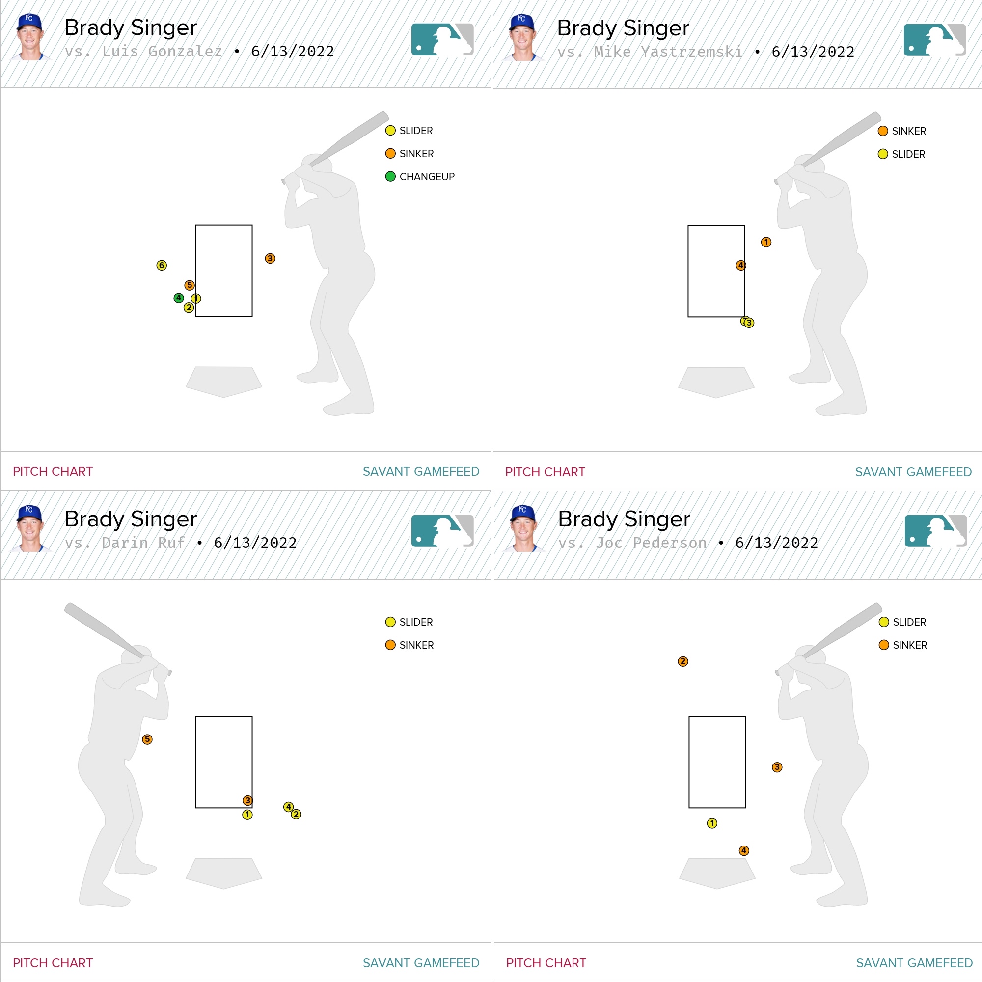 In that moment, it struck me as exactly the kind of approach we’ve been begging to see from Singer since he broke into the big leagues in 2020. Attack high with the fastball, low with the sliders and show the damn changeup. In this instance, he jumped ahead with a change for strike one. The second strike was on the slider down that followed the elevated sinker. And as I noted, the slider that locked up Pederson was set up by the change that faded off the zone. Singer was changing speeds and eye level and locating well.