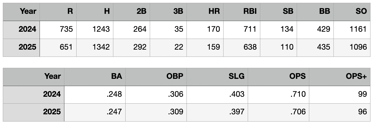 In 2024, the Royals hit .282/.348/.446 with runners in scoring position and averaged 4.5 runs per game. In 2025, they hit .255/.319/.404 with RISP and, as noted above, only scored 4 runs per game. As Picollo pointed out, the offense overall this year was very close to the offense we saw in 2024.