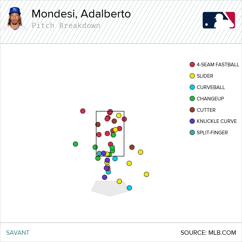 Now I haven’t even gotten to the leader on the Royals in whiff rate. That would be Adalberto Mondesi, who struck out four times on Sunday and seven times in the series. He misses on a whopping 22.6 percent of all swings he takes. Here, you try and find something…