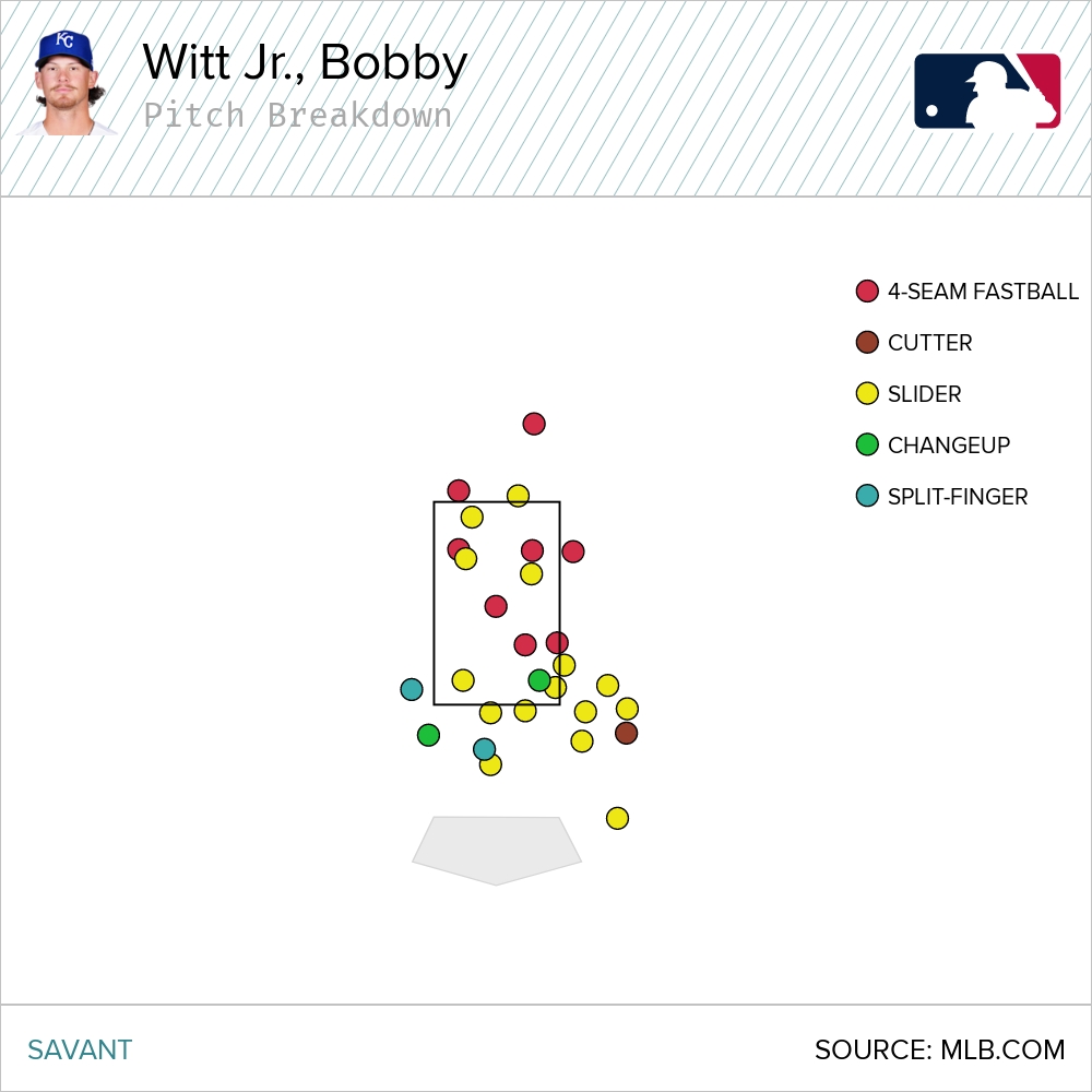 Bobby Witt Jr. has swung and missed on just under 15 percent of his swings. Not great, but maybe what we should have expected in his first month in the big leagues. A look at his pitch chart on the swings and misses can be illuminating. (Note: All of the following whiff rates and charts are through Saturday’s games.)